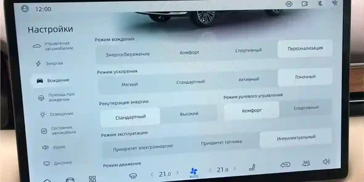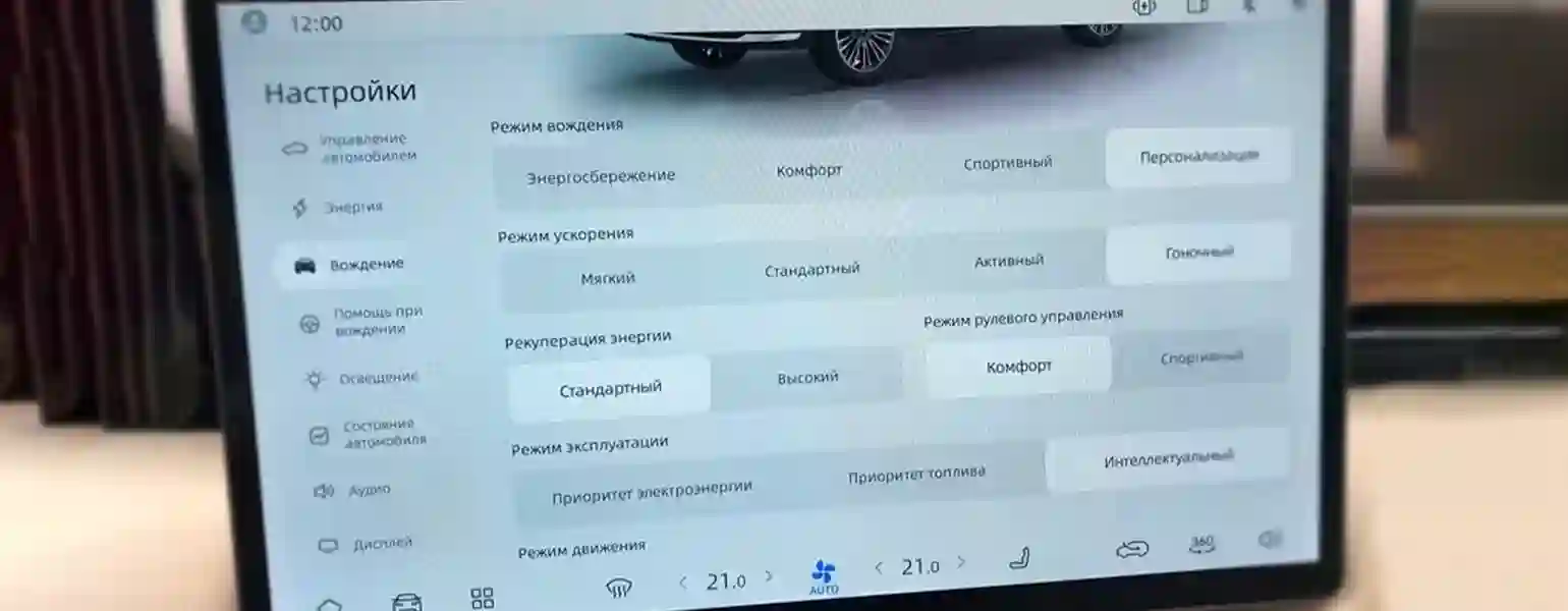 Сначала идем в центральный экран, настраиваем режимы движения, эксплуатации, вождения. Ну, допустим, пусть будет экономичный. Хотя можно включить и гоночный – и сразу же зарычал ДВС, причем на высоких оборотах: в гоночном режиме электромоторы выдают максимум крутящего момента и мощности, поэтому бензиновый двигатель работает по умолчанию. В электрическом режиме эксплуатации двигатель стихает, автомобиль бесшумно едет, расходуя только заряд батареи. Режим «приоритет топлива» – движение с преимущественно включенным ДВС, на бензине. В гибридном режиме автомобиль будет сам решать, когда подключать ДВС. Отдельная вкладка – режимы движения: стандартный, интеллектуальный, скользкая дорога. Пользуясь подсказками приборной панели, можно понять, что «интеллектуальный» – для движения по заснеженной дороге, а «скользкая дорога» – это грязь.