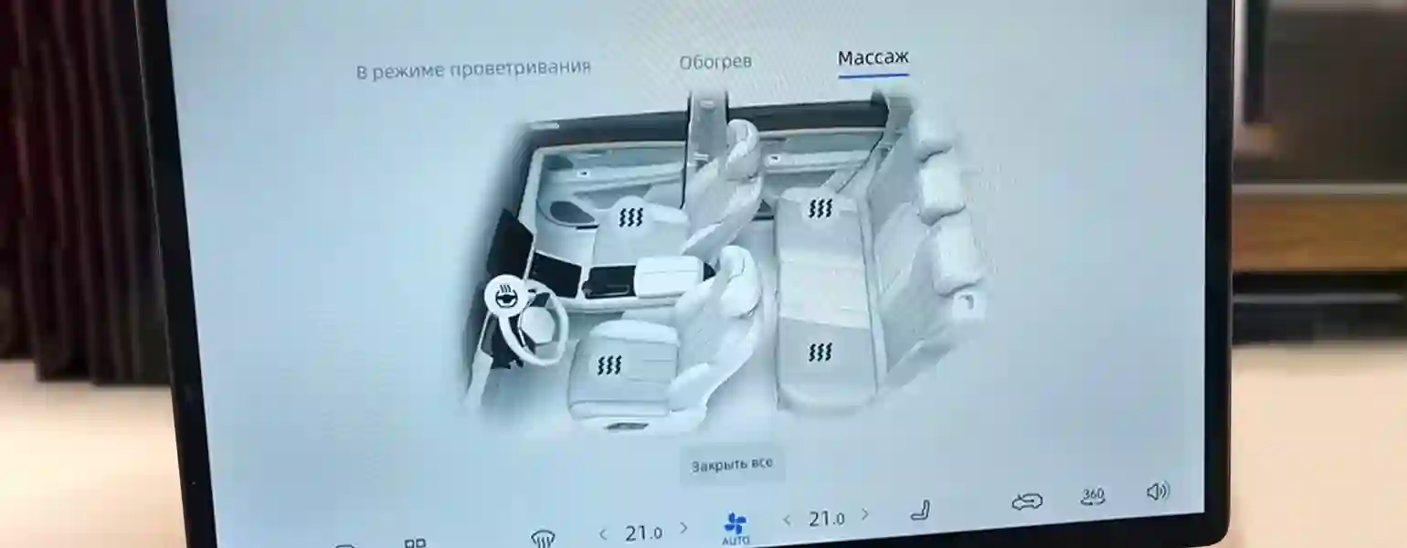 Припоминаю, так же было и в тестовом GLS. На заднем ряду – тоже подогревы, вентиляция и массаж, а для управления климатом у задних пассажиров есть своя панель в обращенном к ним торце центральной консоли. Специальными кнопками можно уронить вперед спинку кресла переднего пассажира и сдвинуть вперед подушку, но это, скорее, для версии с раздельными креслами второго ряда, которые можно превратить в полноценный шезлонг, а у нас пятиместный SERES M7 со сплошным диваном на заднем ряду. Места здесь много, даже для троих – средняя часть дивана плоская. Но наклон спинки дивана не регулируется.